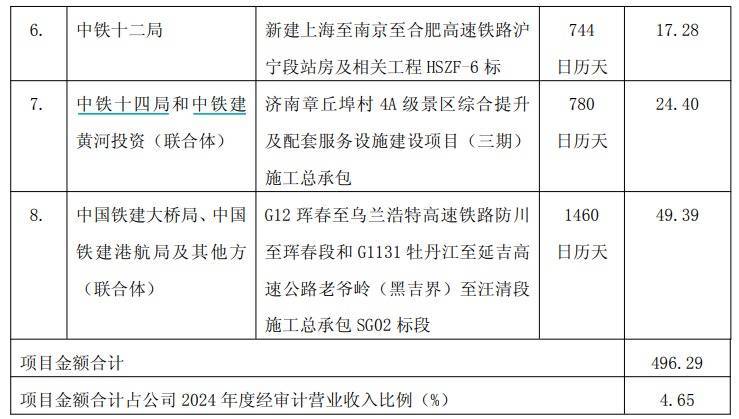 【大河财立方消息】11月17日,中国铁建发布公告,近期,公司中标8个单体15亿元以上重大项目,项目金额合计496.29亿元,占2024年度经审计营业收入的4.65%。