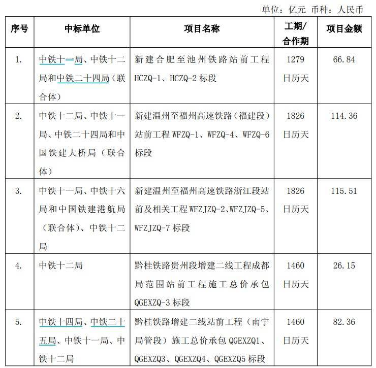 中标项目包括:新建合肥至池州铁路站前工程HCZQ-1、HCZQ-2标段,新建温州至福州高速铁路(福建段)站前工程 WFZQ-1、WFZQ-4、WFZQ-6标段,新建上海至南京至合肥高速铁路沪宁段站房及相关工程 HSZF-6 标等。